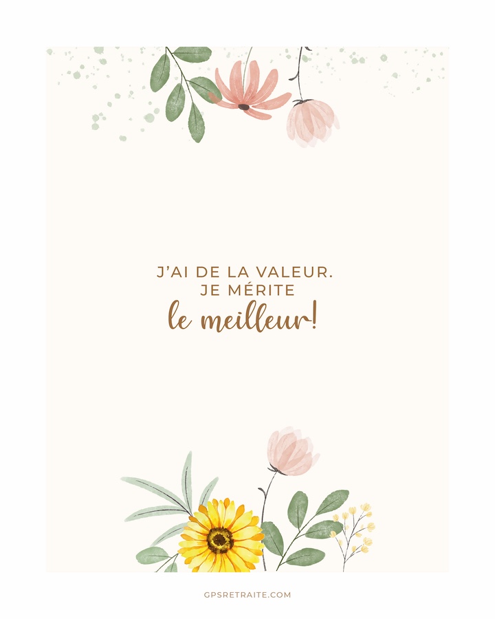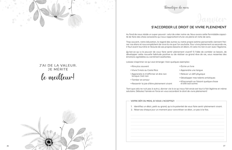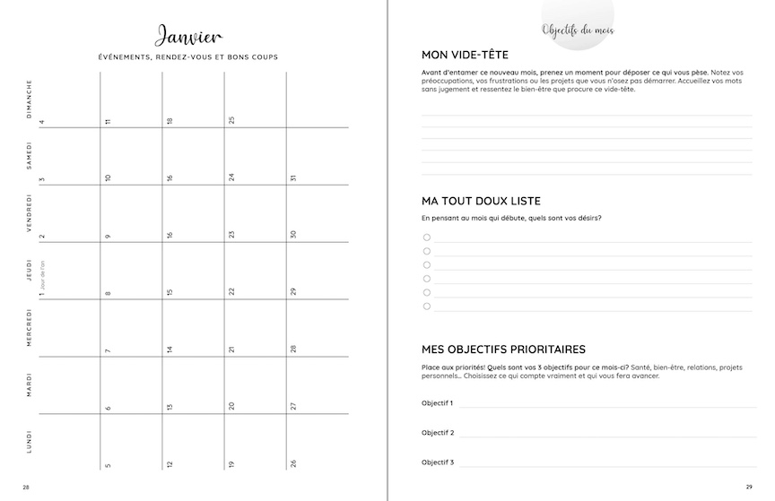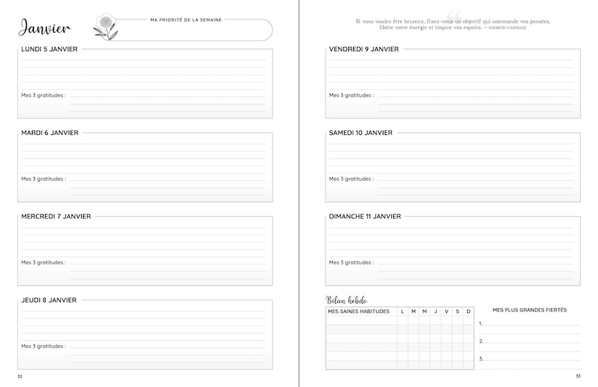 J’ai conçu cet outil pour vous aider à clarifier vos objectifs, structurer positivement votre temps, prendre soin de votre bien-être au quotidien… et ultimement, cultiver un sentiment de gratitude et de satisfaction.