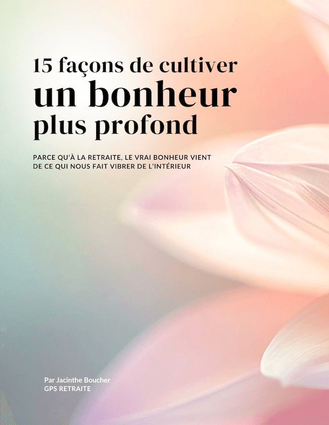 Ce guide exclusif vous dévoile 15 grandes sources de joie et de sens à la retraite. Il vous aidera à nourrir un bonheur plus profond, jour après jour.
